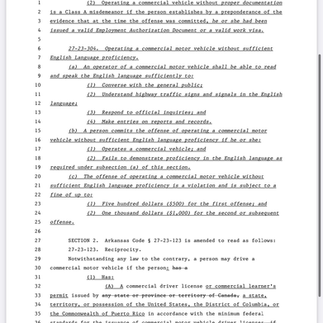 L’Arkansas a rapidement adopté une nouvelle loi imposant des amendes aux camionneurs incapables de démontrer une maîtrise suffisante de l’anglais. Le projet de loi HB1745, déposé le 11 mars, a été adopté à l’unanimité par le Sénat et par 82 voix contre 0 à la Chambre des représentants, le tout en moins d’un mois.