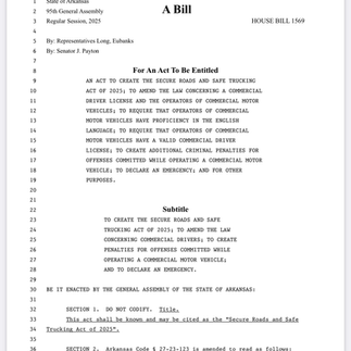 Un projet de loi controversé a été déposé à la législature de l’État de l’Arkansas le 24 février 2025. Le projet de loi 1569 interdirait aux camionneurs titulaires d’un visa B-1, B-2 ou B-1/B-2 de conduire un véhicule commercial dans l’État. Il remettrait également en cause la reconnaissance des permis de conduire commerciaux canadiens en Arkansas.